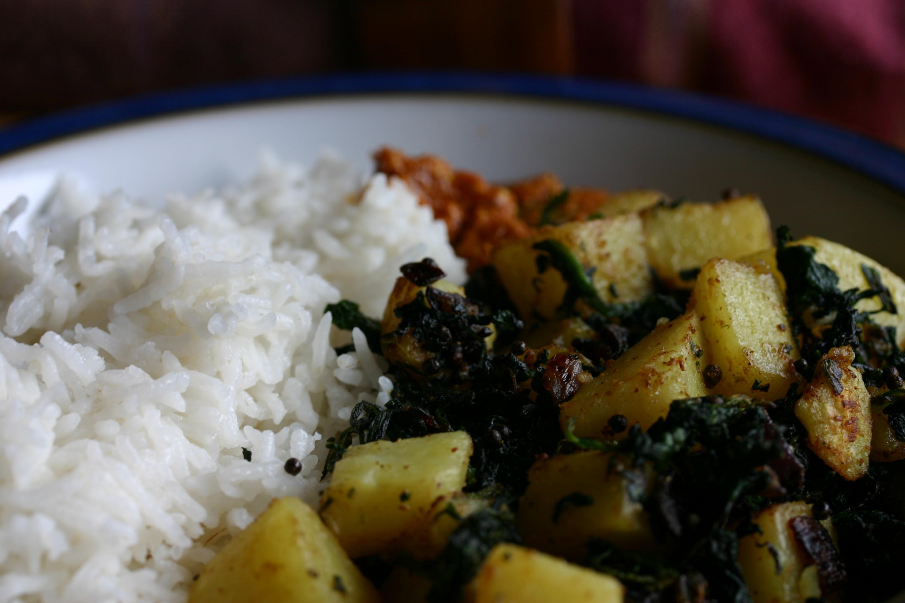 This potato and spinach dish is what I call a dry curry – there is no liquid used in the cooking, resulting in no sauce. It’s an easy weekday, store-cupboard meal. I prefer it with fresh spinach, but frozen also works.