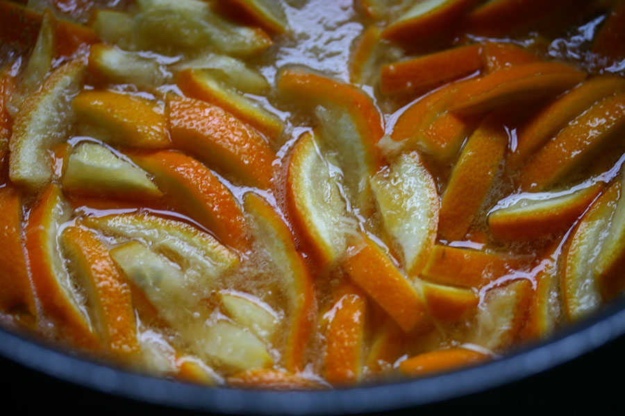 - In a large soup pot, combine the juice, muslin, orange rinds and 2.25 litres of water. Bring to a boil, then simmer on medium heat for 1 1/2 to 2 hours, or until the peel is very soft.