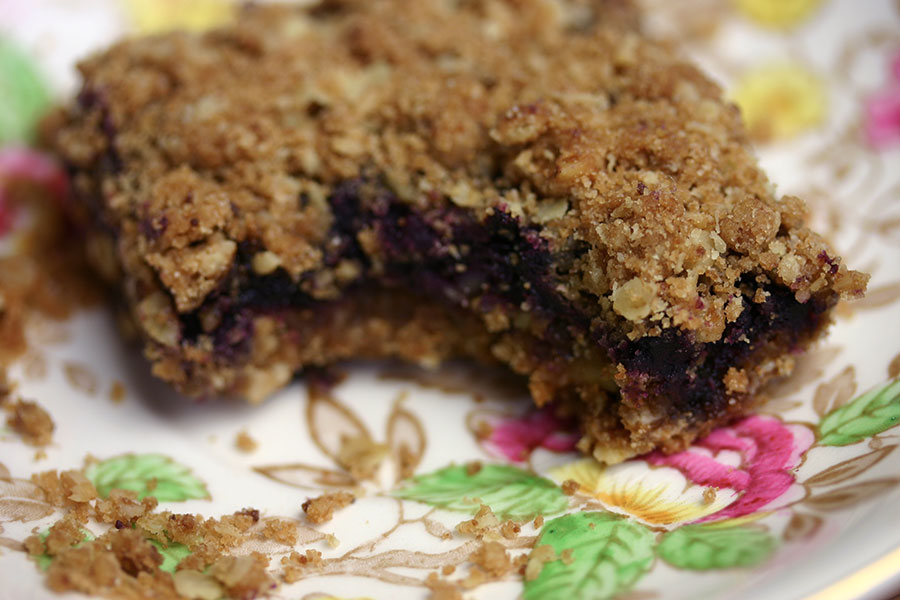 I chose this blueberry mazurka recipe for its similarity to the date squares my family makes at Christmas. It hadn’t occurred to me to use anything other than dates for the middle layer – my eyes are opened to all sorts of possibilities now…;-)
