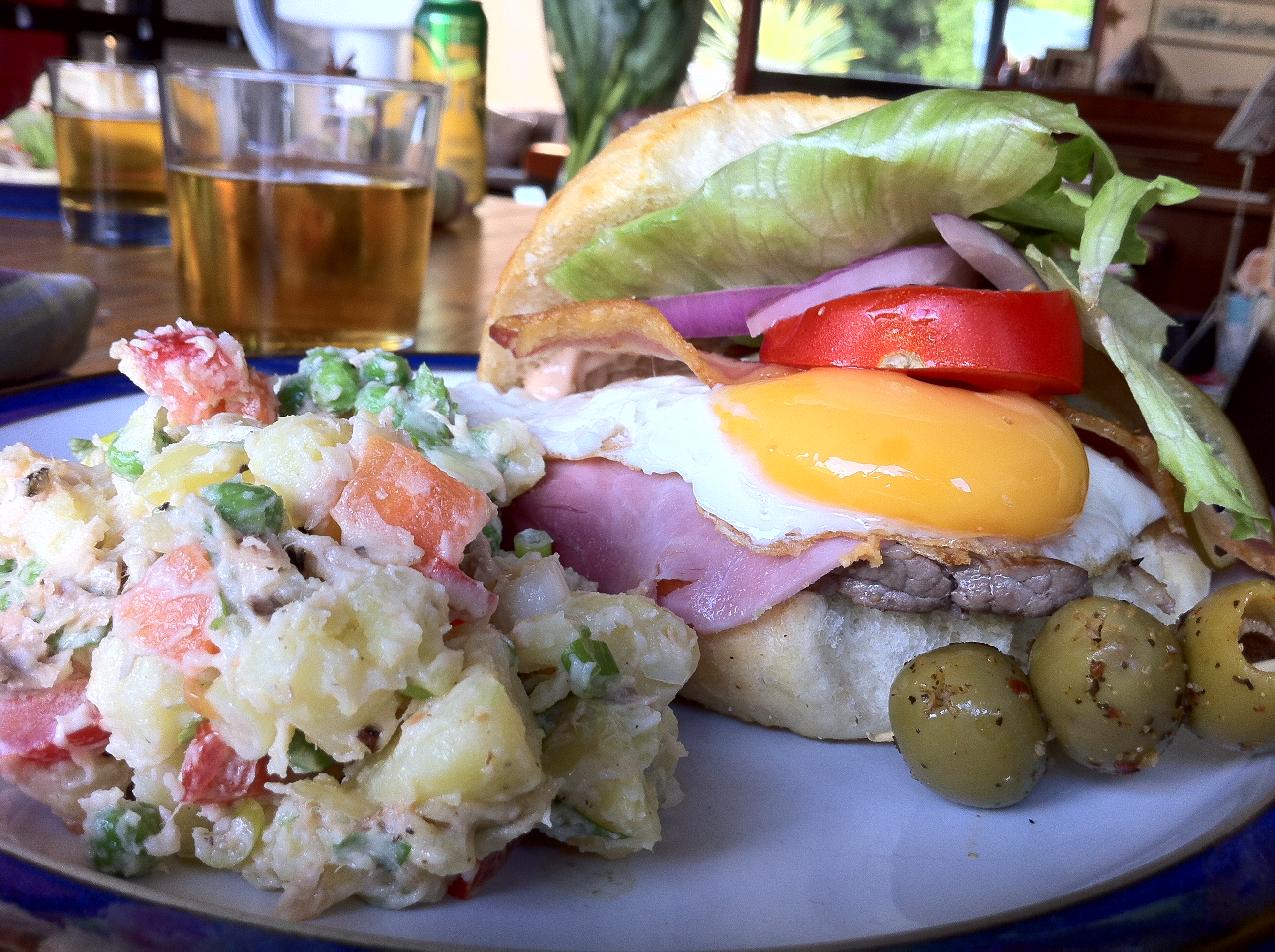 This Uruguayan sandwich is a monster. I looked at a few recipes for chivitos, eventually making it with less than half the meat called for. It still defeated everyone but Adam. This website goes into a lot of detail about how to assemble a chivito. Continue reading