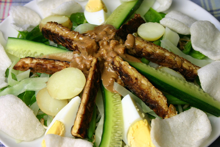 Making gado gado is all about the preparation – boiling potatoes and eggs, steaming green beans, blanching cabbage and beansprouts, frying the tempeh, and achieving a perfect balance of flavours in your peanut sauce. After that, simply a matter of a few moments to pile everything on a plate and tuck in.