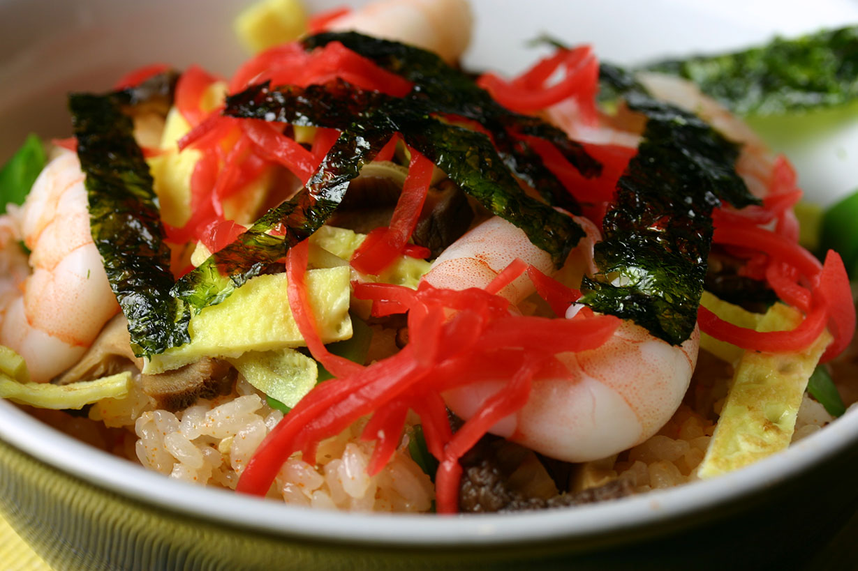 Chirashi sushi is an adaptable dish. It’s colourful and impressive party fare when arranged on a large serving platter, but makes a great midweek supper as well.
